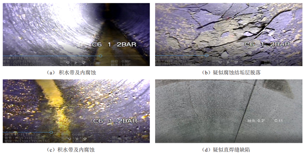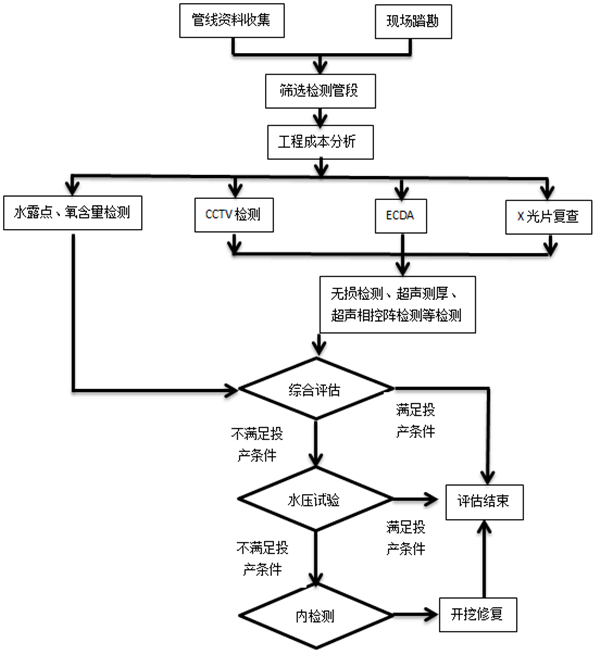 評估重點(diǎn)為管道施工期焊口焊接質(zhì)量;管道外腐蝕情況;管道內腐蝕情況。選取了水露點(diǎn)及氧含量檢測分析、 CCTV檢測、 ECDA、 X光片復查、無(wú)損檢測、超聲測厚、超聲相控陣檢測等綜合檢測及評估方法。
