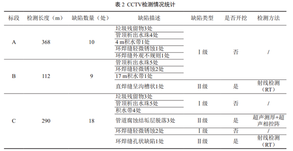 查詢(xún)相關(guān)規范,未查到長(cháng)輸油氣管道CCTV檢測相關(guān)缺陷評級依據。結合相關(guān)項目經(jīng)驗,企業(yè)內部討論得出關(guān)于CCTV檢測缺陷分級標準,缺陷分成兩個(gè)等級,Ⅰ級缺陷是指管內垃圾殘留、管頂析出水珠、管底積水、焊縫輕微銹蝕等不需要開(kāi)挖驗證的缺陷;Ⅱ級缺陷是指可能對管道本體結構造成影響的直焊縫、環(huán)焊縫、腐蝕分層脫落等需要開(kāi)挖驗證的缺陷。檢測情況統計見(jiàn)表 2。