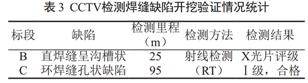 按照管道完整性閉環(huán)管理要求,結合缺陷類(lèi)型和嚴重程度,選取有針對性的檢測方法進(jìn)行開(kāi)挖驗證,焊縫缺陷開(kāi)挖驗證情況見(jiàn)表 3。