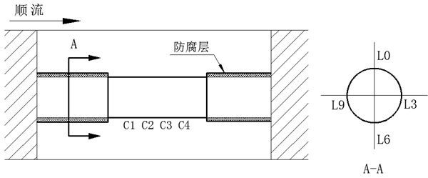 評定為Ⅱ級的3處管道腐蝕結垢層脫落缺陷, 2處具備開(kāi)挖條件,分別位于檢測里程119 m和125 m處,現場(chǎng)開(kāi)挖選取長(cháng)約1 m的檢測管段,采用超聲相控陣檢測未發(fā)現缺陷點(diǎn),采用超聲測厚儀對管道剩余壁厚進(jìn)行測試,檢測里程119 m處、 125 m處管段最小壁厚分別為18.45 mm、 18.75 mm,測厚點(diǎn)部位見(jiàn)圖 4,詳細測試數據見(jiàn)表 4。