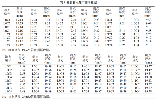 (3)根據超聲測厚的檢測結果,確定管線(xiàn)的腐蝕減薄并不明顯,存在缺陷的管段滿(mǎn)足在設計壓力下運行。