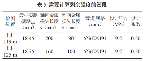 通過(guò)對測試壁厚結果統計顯示,需要計算剩余強度管段數據如表 5。