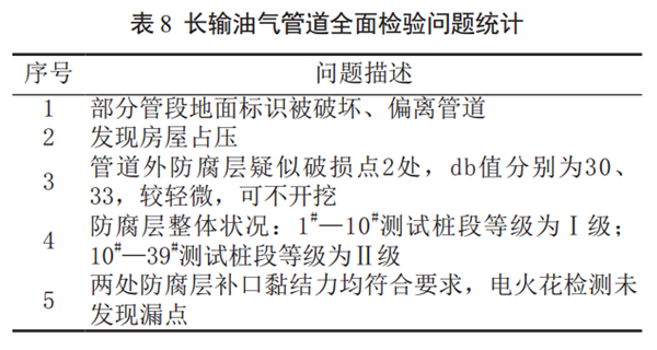 參照SY/T 0087.1―2006《鋼質(zhì)管道及儲罐腐蝕評價(jià)標準埋地鋼質(zhì)管道外腐蝕直接評價(jià)》 TSG 7003―2010《壓力管道定期檢驗規則―長(cháng)輸(油氣)管道》,對該段管道開(kāi)展全面檢驗,并出具合于使用評價(jià)報告,檢測結果見(jiàn)表 8。