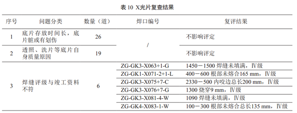 依據施工期執行的SY/T 4109―2005《石油天然氣鋼質(zhì)管道無(wú)損檢測》,對施工期焊口X光片進(jìn)行復查,檢查及評價(jià)焊口焊接質(zhì)量,具體復查結果見(jiàn)表 10。