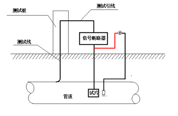 為驗證IR降大小與通電電位的關(guān)系,通過(guò)極化試片法對地鐵附近管道監測數據進(jìn)行了對比分析,極化試片法的測試接線(xiàn)如圖 1所示,通過(guò)信號斷路器的中斷,可以測試與管道連接的試片的通/斷電位。