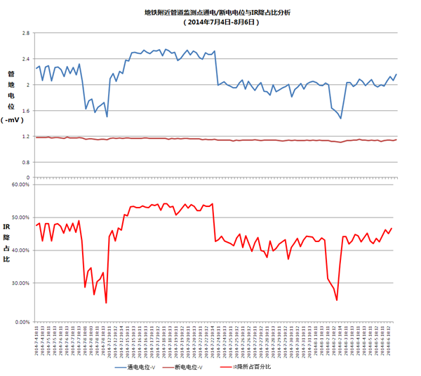 在日常測試和評價(jià)陰極保護有效性過(guò)程中,應充分理解通電電位、 IR降和斷電電位之間的關(guān)系。由于通電電位測試相對容易便捷,在現場(chǎng)測試過(guò)程中部分工程人員往往利用測試樁處某次測得的通電電位、IR降和斷電電位,將IR降部分作為一個(gè)固定值或者通電電位的線(xiàn)性百分比來(lái)計算保護電位。實(shí)際上, IR降占比是隨通電電位變化的,隨著(zhù)季節性土壤電阻率變化, IR降占比也會(huì )變化,應充分理解IR降和管道極化的意義及與通電電位的關(guān)系,避免錯誤判斷陰極保護的有效性。