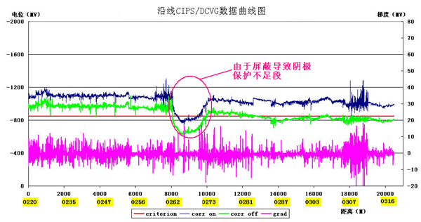 近年來(lái),管道外防腐層整體性能大幅提升,導致沿管道的陰極保護電流衰減通常并不明顯,在間隔為1千米的測試樁上測得的管地電位基本可以體現管道的陰極保護水平。對于衰減較大的管道或外防腐要求較高的管道,定期開(kāi)展密間隔電位測試有助于更加準確地分析判斷陰極保護效果和重新定義管道陰極保護率,及時(shí)發(fā)現短距離范圍陰極保護不足和整改局部孤立外防腐層破損、搭接和干擾防護不足的問(wèn)題。如在密間隔電位測試中發(fā)現由于其他構筑物接地造成陰極保護電流屏蔽形成的陰極保護不足,圖 3所示。