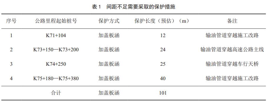 經(jīng)現場(chǎng)踏勘,并依據佛開(kāi)高速擴建項目涉石油管道統計表進(jìn)行現場(chǎng)排查后,輸油管道與高速公路相對位置不足需要采取的保護措施見(jiàn)表 1。