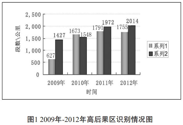 2012年, 為更好的開(kāi)展高后果區識別工作,結合管轄業(yè)務(wù)范圍擴大及管道區域化管理, 總結高后果區識別經(jīng)驗, 對高后果區識別報告模板進(jìn)行了更新。 實(shí)現了一個(gè)分公司一個(gè)高后果區識別報告, 在簡(jiǎn)化工作量的基礎上, 使識別工作流程順暢, 達到了管理提升的目的。 全年公司共識別出1755個(gè)HCA段, HCA段總長(cháng)2014km, 占公司管道里程的15.2%, 人口稠密區900段, 總長(cháng)1425Km。 對比上年公司HCA段增加307段, 總長(cháng)增加252Km, 主要原因為西一線(xiàn)新疆、 甘肅段及澀寧蘭管道的劃轉。 全年公司高后果區識別率100%。 2009—2012年高后果區識別情況見(jiàn)圖1: