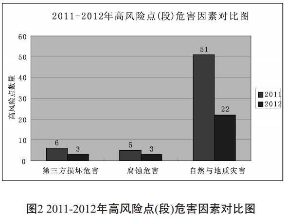 根據評估結果, 2012年共識別出高風(fēng)險點(diǎn)28處, 其中第三方損壞危害因素為主導的高風(fēng)險點(diǎn)有3處, 腐蝕危害因素為主導的高風(fēng)險點(diǎn)有3處, 自然與地質(zhì)災害因素為主導的高風(fēng)險點(diǎn)有22處。 對比2011年, 高風(fēng)險點(diǎn)數降低34個(gè)。 公司已經(jīng)對全部高風(fēng)險點(diǎn)進(jìn)行完整性評價(jià), 高風(fēng)險點(diǎn)完整性評價(jià)覆蓋率達到100%。 針對以上風(fēng)險點(diǎn),公司對第三方損壞和腐蝕危害因素為主導的高風(fēng)險點(diǎn)已經(jīng)采取管道巡護、 增加警示牌、 定期巡護及編制應急預案等一系列手段進(jìn)行了臨時(shí)控制,并計劃于2013年采取工程措施進(jìn)行風(fēng)險治理; 自然與地質(zhì)災害因素為主導的高風(fēng)險點(diǎn)均采用水工保護措施進(jìn)行了治理。 2012年公司高風(fēng)險管段控制覆蓋率為100%。 (見(jiàn)圖2)