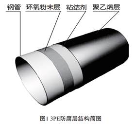 3PE防腐層是目前國內外采用最為廣泛的一種鋼管防腐形式。 其主要結構為: 最底層的環(huán)氧粉末層、 中間粘結劑層和最外層的聚乙烯防腐層。 3PE涂層的優(yōu)越性能主要是它將底層環(huán)氧粉末、 中間層粘接劑和外層聚乙烯有機地結合成了一個(gè)整體, 從而使該涂層具有熔結環(huán)氧粉末涂層和聚乙烯涂層的雙重優(yōu)點(diǎn)。 (見(jiàn)圖1)