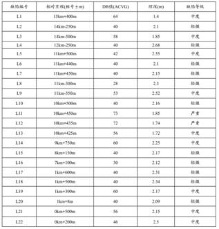 發(fā)射機設在16號測試樁, 位于1號閥下游河床附近, 距1號閥室約500m; 接地選擇在河床中, 接地效果良好; 發(fā)射機輸出頻率為3HZ、 6HZ、 128HZ; 電流強度為2A; 接收機自1號閥室至0號測試樁進(jìn)行檢測, 信號電流測試和ACVG檢漏同步進(jìn)行, 信號電流檢測間距為25m, ACVG檢漏間距約15m。 本次檢測管道所經(jīng)地形較為復雜, 有山區石方段、 居民聚居段、 高填方段、 戈壁段、 高壓輸電線(xiàn)路及變電站并行段、 混凝土蓋板保護段、 鐵路穿越、 公路穿越等, 檢測距離約16Km。 DM內外業(yè)一體化型管道防腐層檢測系統操作步驟較為簡(jiǎn)便,顯示界面非常清晰、 直觀(guān), 在近9m的高填方段準確的測量出管道的埋深; 在高壓輸電線(xiàn)路及變電站并行段基本不受雜散電流的干擾, 在混凝土蓋板保護段也能準確測量出管道外防腐層的缺陷部位置, 檢測效率及精度大大提高。 本次檢測共查找出22處不同程度的管道外防腐層缺陷。 詳見(jiàn)下表。