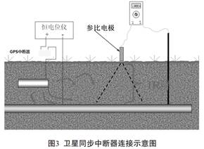 在恒電位儀陽(yáng)極或陰極串入衛星同步中斷器, 設置通斷周期, 在測試樁處通過(guò)使用萬(wàn)用表與便攜式參比電極進(jìn)行測試, 具體連接見(jiàn)圖3。通常采用“通12s, 斷3s”的通斷周期, 在一個(gè)通斷周期15s內, 讀取兩個(gè)參數即通電電位和斷電電位, 在通12s內萬(wàn)用表讀數基本穩定在一個(gè)數值即得到通電電位, 在斷3s內發(fā)生斷電瞬間萬(wàn)用表顯示第一個(gè)數值即斷電電位。 通過(guò)分析斷電電位是否達到-850mv標準, 評價(jià)管道是否處于陰極保護系統有效保護。