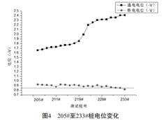 以新疆某油田一條輸氣管道為例, 在使用手動(dòng)中斷法進(jìn)行斷電電位測試時(shí), 發(fā)現從205#樁至末站之間管道通電電位負于-850mv, 而斷電電位遠未達到-850mv, 圖4為205#至233#樁電位變化, 說(shuō)明這段管道未處于陰極保護系統有效保護。