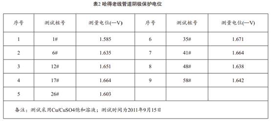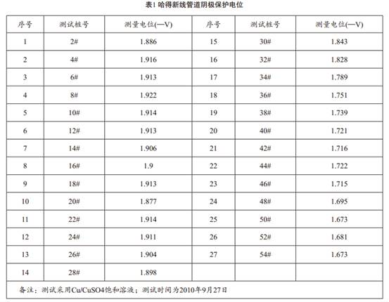 服役初期哈得輸油新老線(xiàn)陰極保護系統運行均正常,但從2004年起哈得新線(xiàn)陰極保護系統出現異常,分別上調兩座陰保站恒電位儀輸出,但全線(xiàn)陰極保護電位仍處于較負狀態(tài),全線(xiàn)管道陰極保護電位逐步偏負,管道上陰極保護電位比恒電位儀輸出電位還負,最終停運全線(xiàn)兩座陰保站,但管道陰極保護電位仍達-1.8至-2.0v,數據見(jiàn)表1。哈得老線(xiàn)陰極保護系統于2009年出現同哈得新線(xiàn)相同現象,管道陰極保護電位仍達-1.5至-1.6v,數據見(jiàn)表2。