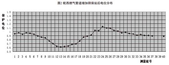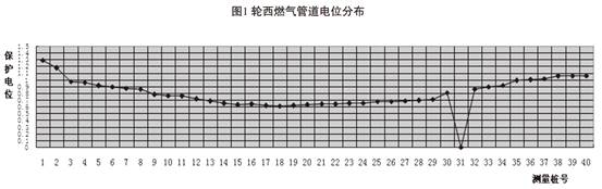 輪西燃氣管道由于防腐層老化導致陰保站中間陰極保護電位未達標準,見(jiàn)圖1。 2011年12月油氣運銷(xiāo)部對該管道使用ACVG法進(jìn)行防腐層破損點(diǎn)檢測,共計發(fā)現破損點(diǎn)1288處。其中嚴重漏點(diǎn)11處、中度漏點(diǎn)164處、輕度漏點(diǎn)1113處,防腐層評級為劣,導致上調管道兩端恒電位儀輸出,管道陰保站中間部分“欠保護”一直存在。