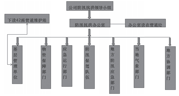 公司成立以生產(chǎn)主管副總經(jīng)理為組長(cháng), 相關(guān)部門(mén)主要領(lǐng)導為成員的防汛工作領(lǐng)導小組。 防汛領(lǐng)導小組辦公室設在管道處, 負責防汛工作的日常管理和信息匯總、 傳遞等工作。
