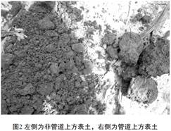 在臨澤縣沙河鎮化音村管道穿越的一農戶(hù)農田, 調查人員發(fā)現管道上方耕作層的土壤為黑灰色泥炭狀土, 無(wú)團粒結構, 粘接成塊; 同一地塊非管道上方的耕作層土壤雖也有摻雜的黑色泥炭土, 但土質(zhì)松軟、 團粒結構良好(圖2) 。