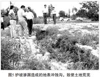 臨澤縣沙河鎮何家莊村二社, 因管道施工修建的攔水垻護坡滲漏, 造成某村民2畝多耕地水土流失嚴重, 地表塌陷, 無(wú)法利用, 只好棄耕(圖5) 。 去年調查時(shí)我們曾提出建議、 要求施工部門(mén)限期修復, 這次去發(fā)現水流沖蝕的溝、 洞還在,而且比去年更嚴重。 據農民和村干部說(shuō), 滲漏現象不僅出現在護坡處, 因埋管道時(shí)填土不實(shí), 水沿管道滲漏沖蝕, 致使農田地表塌陷的現象也常常發(fā)生。