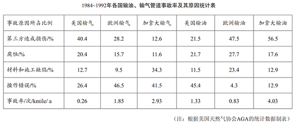 對近三十年來(lái)國外在役油氣管道安全現狀統計得出如下數據: 歐洲、 加拿大、 前蘇聯(lián)、 美國輸氣管道事故率分別為0.42(西歐國家為0.25)起/千千米•年、 2起/千千米•年(1975~1982年) 、 0.46起/千千米•年、 0.60起/千千米•年。 相比之下, 2006年我國川渝地區12條輸氣管道為4.3起/千千米•年, 東北和華北地區為2.0起/千千米•年, 可見(jiàn)我國長(cháng)輸管道事故頻率遠高于國外。