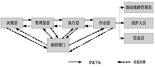 為滿(mǎn)足管道完整性管理的需要,西氣東輸贛湘管理處建立了完整性管理信息傳遞流程, 企業(yè)內部設立了五個(gè)層級, 并且將管道沿線(xiàn)政府部門(mén)納入流程之中, 從而使企業(yè)內部之間、企業(yè)與與外部之間形成了較為完整的信息下達與反饋鏈條。 如圖1所示。