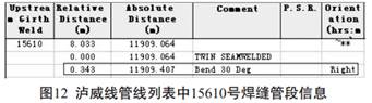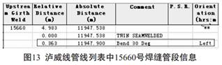 但還有更簡(jiǎn)單的方法。 同樣以圖8所示缺陷為例, 通過(guò)PII橫向功能列表里面中的“ Pipeline”按鍵可打開(kāi)管線(xiàn)列表(注: 管線(xiàn)列表主要記錄了每段管節的長(cháng)度, 焊縫里程、 彎頭度數等信息) 。