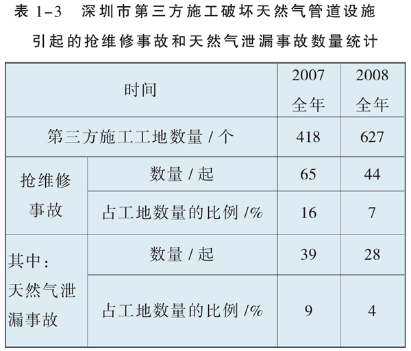 表1-3為深圳市第三方施工破壞天然氣管道設施引起的搶維修事故和天然氣泄漏事故數量統計。從中可以看出來(lái),第三方施工對天然氣管道的安全運營(yíng)有很大的影響。第三方施工造成的天然氣泄漏事故兒乎占到了施工總數的10%。