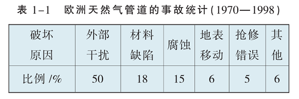 W. Kent Muhlhaue:指出管道失效的原因主要有設計原因、操作原因、腐蝕原因和第三方破壞。在管道失效的事故統計數據中,由于第三方破壞而造成的管道失效占有很大的比例。表1-1和表1-2為歐洲和美國天然氣管道的事故統計分析。從表中可以看出,管道第三方破壞已成為管道失效的主要原因。