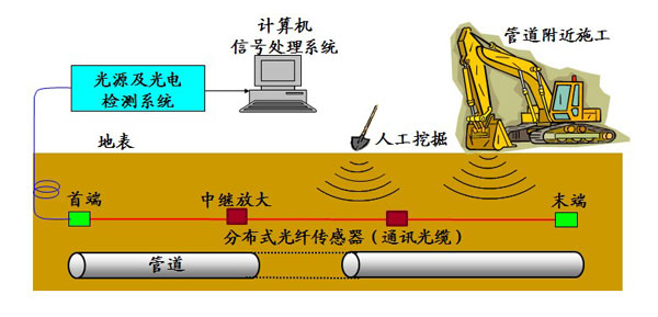 為及時(shí)發(fā)現、實(shí)時(shí)監控管道上方的第三方施工情況,所屬廣東管網(wǎng)公司采用了光纖預警系統。該系統利用與管道同溝敷設的通信光纜作為分布式土壤振動(dòng)檢測傳感器,長(cháng)距離連續實(shí)時(shí)監測管道沿線(xiàn)的土壤振動(dòng)情況并形成以光纜為圓心的管道保護帶,當外界有挖掘等振動(dòng)發(fā)生時(shí),光纜會(huì )隨之振動(dòng),同時(shí)光纖捕獲振動(dòng)信號,并經(jīng)預警系統對信息進(jìn)行識別和數據處理,實(shí)現對可能危害管道安全的動(dòng)土事件進(jìn)行識別、定位和預警。具體詳見(jiàn)下圖: