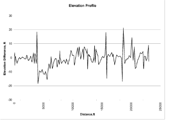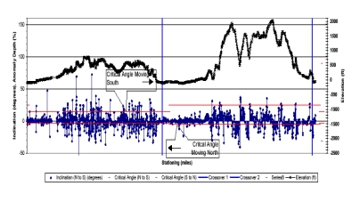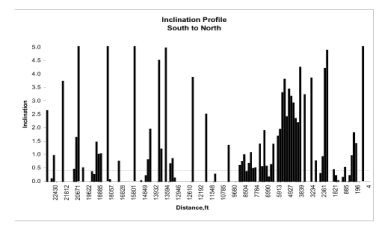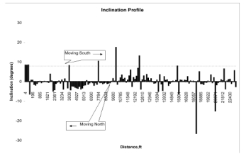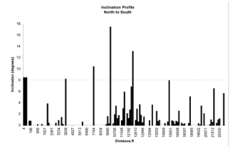 管道走向高程剖面由手持GPS確定,確定管道的埋深,高程剖面在圖6中顯示,相對于其他點(diǎn)最北的點(diǎn)設置為零,從高程剖面圖可以看出,計算出傾斜剖面圖傾斜角,在雙向與最大臨界角相比較,圖7為結果的描述。