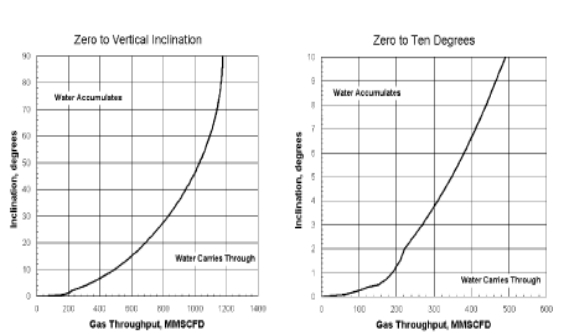 即使腐蝕現象發(fā)生在44 feet/13m的位置,或如果在入口溫度不為常數,下一個(gè)位置大于臨界角8度,位于大約3840 feet/1170m點(diǎn)處,如果沒(méi)有腐蝕在該位置出現,那么下游腐蝕是不可能的發(fā)生的。然而,管道承受一定的壓力范圍,上游腐蝕問(wèn)題必須考慮,這是因為在一段時(shí)間內的增壓和減壓或總流量的增減,在低的臨界角位置處,一次水積聚的腐蝕干擾現象可能發(fā)生。下一個(gè)最高的上游角度在2050 feet/625米的位置(3.8度傾斜角),任何液滴到達這個(gè)位置時(shí),可能會(huì )積聚也可能會(huì )傳輸到下一個(gè)位置3840feet/1170m處,在2050 feet/625m位置沒(méi)有腐蝕出現則在2050 feet/625m至3840 feet/1170米處是不可能出現腐蝕的。下一個(gè)上游能夠積聚水的位置是125 feet/38m處(0.72度傾斜角),任何不能到達38m處的液滴將被輸送到2050 feet/ 625m處,125 feet /38m處無(wú)腐蝕出現則125 feet/38m和2050 feet /625m之間管段不可能出現腐蝕。
