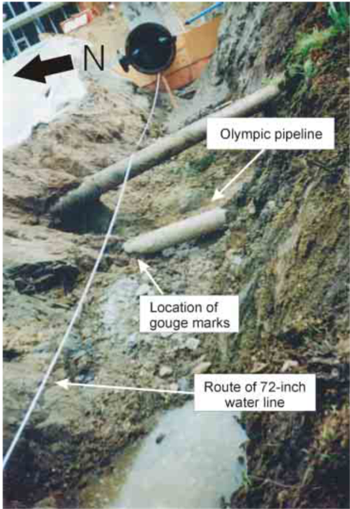 NTSB通過(guò)對事故相關(guān)人員的訪(fǎng)談、管道運行與控制情況調查、管道附近開(kāi)挖歷史信息資料查閱、1991年以來(lái)管道漏磁內檢測數據信息排查、聯(lián)邦法規和行業(yè)標準的符合性檢查、以及事故管段實(shí)驗室分析等工作,確定管道發(fā)生破裂的可能原因為:①1994年Bellingham市水處理廠(chǎng)改造工程中,負責工程施工的IMCO公司造成Olympic管徑406 mm成品油管道損壞(圖 2),同時(shí)Olympic對IMCO公司施工監管不力。② Olympic對管道內檢測結果的評估不夠準確,導致未能及時(shí)對第三方損壞管段進(jìn)行開(kāi)挖修復。③Olympic在啟輸前,沒(méi)有測試管道系統中的所有安全裝置,導致事故狀態(tài)下安全閥未能正常工作。④未能調查和糾正該管道系統的終端截斷閥反復發(fā)生非預期關(guān)閉,導致泄漏狀況進(jìn)一步惡化。⑤遠程監控及數據采集系統(SCADA)的數據庫開(kāi)發(fā)工作和常規操作存在問(wèn)題,導致SCADA系統關(guān)鍵時(shí)刻無(wú)法做出有效應答。