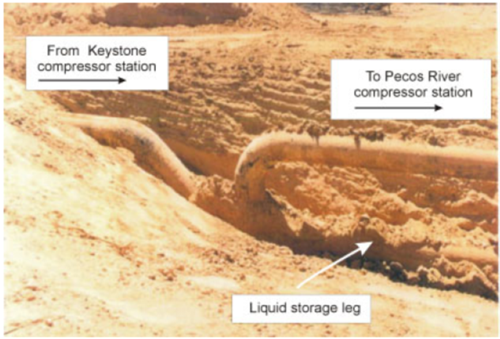 1103管道于1950年建成,位于Keystone壓縮機站和Pecos河壓縮機站之間。根據API 5LX標準(1948年第一版)制造的管道,管道外徑762 mm,管材X52,公稱(chēng)壁厚8.5 mm,穿跨越處管壁加厚;采用雙向埋弧焊環(huán)焊縫,陰極保護,煤焦油涂層。
