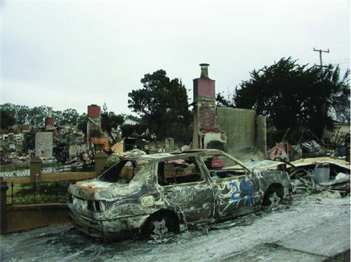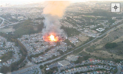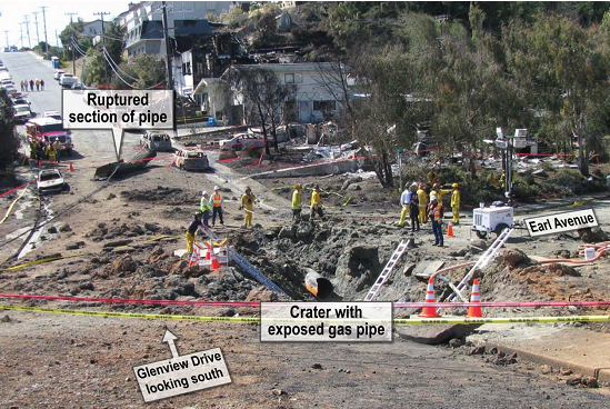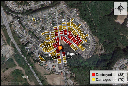 132管線(xiàn)破裂爆炸火災影響區域以管道爆炸點(diǎn)為中心半徑約183 m,主要向東北方向蔓延;馂牟108座房屋,其中30座被摧毀,17座嚴重損壞,53座輕微損壞。此外,74輛汽車(chē)、一個(gè)公園林地和一個(gè)游樂(lè )場(chǎng)被損壞或燒毀。根據PG&E報告,管道修理費用1 350萬(wàn)美元,泄漏天然氣價(jià)值26.3萬(wàn)美元。