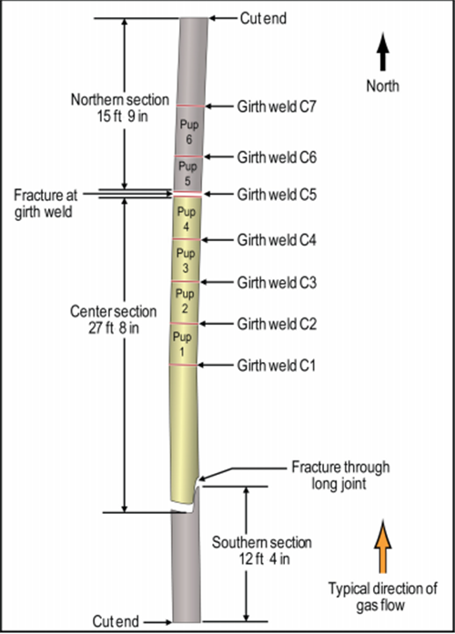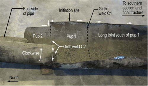破裂管道和其南北各截取的管道均送至NTSB材料實(shí)驗室進(jìn)行相關(guān)檢驗。南部截取段為直縫鋼管的一部分,中間段(即破裂爆炸段)由4根短管和與南部截取段相連接的直縫鋼管的一部分焊接而成,北部段由2根短管和另一端的直縫鋼管的一部分組成。為方便識別,6根短管由南至北依次編號1–-6,連接短管的環(huán)焊縫由南至北依次編號C1–C7(圖 7)。
