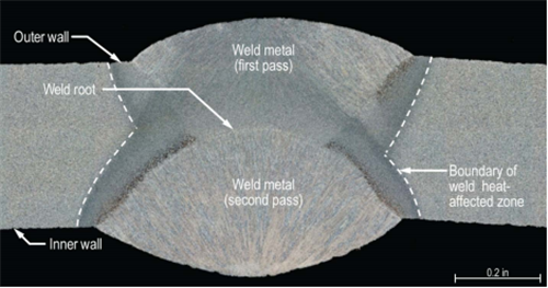 4 、5號短管的縱向焊縫外部均采用熔焊處理,內部采用手工電弧焊。焊縫外表面經(jīng)過(guò)了打磨處理。4號短管接近焊透,5號短管外部熔深1.85 mm,內部熔深1.83 mm。經(jīng)X光檢測,4號短管直焊縫存在表面未焊透、氣孔、咬邊缺陷,5號短管整個(gè)直焊縫區均存在未焊透缺陷。