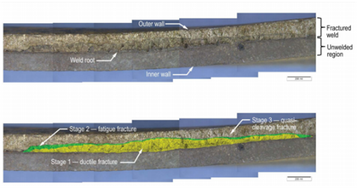 管體破裂起源于中間段1號短管的直焊縫,C1環(huán)焊縫以北0.516~0.577 m處存在的未焊透裂紋的位置。光學(xué)和電子顯微鏡的檢測結果表明,管體發(fā)生破裂前,裂紋在其初始位置通過(guò)兩種模式擴展。裂紋首先在焊縫根部發(fā)生韌性斷裂,其擴展導致焊接連接區域逐漸減小,管體破裂初始位置裂紋達6.096 cm,并占據整個(gè)區域的33%(一階段);裂紋隨后以疲勞斷裂模式增長(cháng),使得連接區域進(jìn)一步減小約10%(二階段);最終發(fā)生準解理斷裂導致管體破裂(三階段)(圖 10)。只在1號短管的焊縫根部發(fā)現小范圍的疲勞裂紋,其他短管的直焊縫根部均表現為韌性斷裂,且其邊緣沒(méi)有疲勞跡象。