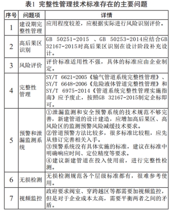 通過(guò)對近30家單位的調研,分析得出了目前油氣管道標準在管理、法律法規、標準體系和技術(shù)方面存在的近百個(gè)問(wèn)題,其中完整性管理方面存在的主要問(wèn)題見(jiàn)表 1。