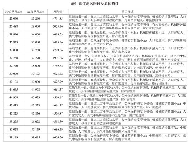 從以上計算結果可以看出,對該段管線(xiàn)風(fēng)險影響最大的因素主要為第三方損壞和失效高后果。篩選分析后得出的相對較高風(fēng)險管道及原因描述如表1所示。