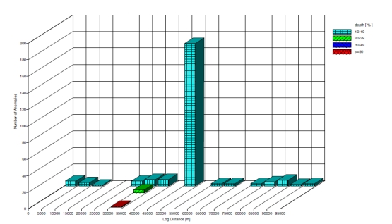 注:金屬損失缺陷范圍劃分:深度10~19 %;深度20~29%;深度30~49%;深度>50 %。