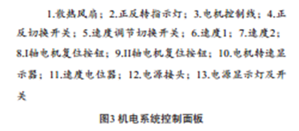 機電控制系統主要是通過(guò)機電控制箱實(shí)現對運動(dòng)執行機構中安裝的兩個(gè)私服電機進(jìn)行供電、速度控制和過(guò)載保護。機電控制箱面板上設置有控制電機正反轉按鈕、電源開(kāi)關(guān)按鈕、兩個(gè)固定速度按鈕、兩個(gè)電機報警復位開(kāi)關(guān)按鈕、電機無(wú)級調速器、電機轉速顯示器和相關(guān)指示燈等器件,如圖3所示。