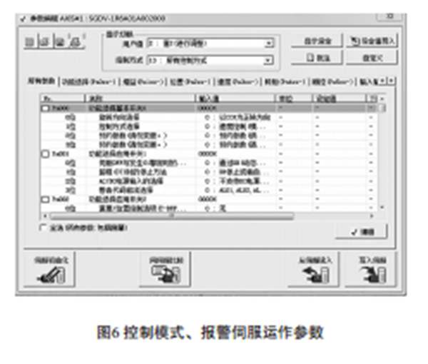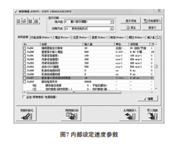 通過(guò)sigmawin+軟件可以實(shí)現對伺服電機的控制模式選擇(位置,速度, 轉矩控制)、機能使用、不使用設定、報警時(shí)的伺服運作、電機回轉方向的設定、I/O信號的開(kāi)斷、各種增益、位置決定單位、速度、及轉矩指令、信號、點(diǎn)動(dòng)速度、有關(guān)轉矩速度的參數、連續參數等參數的設置。在這里對控制模式、內部設定速度、報警時(shí)的伺服運作進(jìn)行了相應設定,其他參數采用默認值。如圖6、圖7所示。
