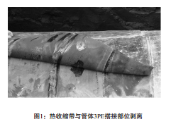 失效表現:熱收縮帶與管體3PE防腐層搭接部位密封失效,呈現剝離狀態(tài)(見(jiàn)圖1),在熱收縮帶兩側搭接處進(jìn)行電火花檢漏時(shí)有漏電現象。