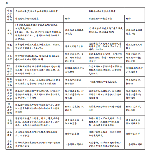 塔里木輸油氣分公司所轄西一線(xiàn)失效補口的修復自2013年9月啟動(dòng)、 12月初結束。通過(guò)對兩種修復方案各個(gè)作業(yè)工序的全程跟蹤,每道作業(yè)工序的現場(chǎng)實(shí)施過(guò)程進(jìn)行了對比分析(見(jiàn)表一)。