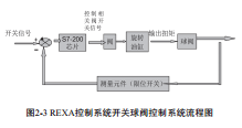 REXA執行器開(kāi)關(guān)球閥控制系統是一個(gè)完整的閉環(huán)控制系統,它由開(kāi)關(guān)信號經(jīng)PLC生成控制信號控制流量配對閥開(kāi)閉,液壓油進(jìn)入旋轉油缸驅動(dòng)活塞帶動(dòng)齒條運動(dòng)輸出扭矩,實(shí)現開(kāi)閉球閥。球閥開(kāi)閉到位后電器接近開(kāi)關(guān)(限位開(kāi)關(guān))開(kāi)關(guān)被激活,執行器停止轉動(dòng), PLC顯示實(shí)際位置信號。開(kāi)關(guān)球閥的控制系統流程圖如圖2-3所示。