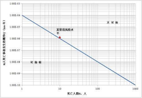 采用已有模型,計算得出個(gè)體風(fēng)險為4.85E-05,處于個(gè)體風(fēng)險可接受區;將計算所得的死亡人數和事故發(fā)生概率通過(guò)F-N曲線(xiàn)進(jìn)行風(fēng)險評價(jià)。由圖10可見(jiàn),評價(jià)管段的社會(huì )風(fēng)險位于F-N曲線(xiàn)的不可接受區,說(shuō)明該管段所處地區等級升級后,社會(huì )風(fēng)險水平略高于標準規定,需要采取相應的風(fēng)險減緩措施。