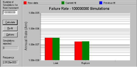 腐蝕缺陷的尺寸是隨時(shí)間增長(cháng)的,腐蝕失效概率與時(shí)間具有相關(guān)性;第三方設備撞擊造成的失效概率與時(shí)間無(wú)關(guān),管道每公里每年的失效概率等于每公里每年的沖擊次數和每次沖擊造成的失效概率之積。管道腐蝕失效概率和第三方破壞失效概率分別使用加拿大C-FER公司PRISMTM軟件中的時(shí)間相關(guān)模型和時(shí)間無(wú)關(guān)模型進(jìn)行年失效概率的計算。