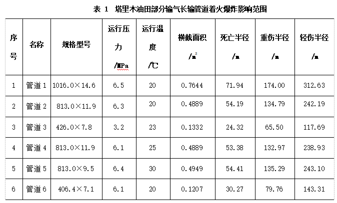 以塔里木油田部分輸氣長(cháng)輸管道為例,當管道發(fā)生泄漏著(zhù)火、爆炸時(shí),危害距離、影響范圍不僅與運行壓力有關(guān),而且與管徑、運行溫度有關(guān),管徑越大、溫度和壓力越高,危害距離和影響范圍就越大,詳細數據見(jiàn)表1。建議管道運營(yíng)單位以輸氣管道爆炸造成的輕傷半徑為影響半徑,將爆炸影響半徑內穿越或毗鄰公路、鐵路區域段管道納入高后果區管理。同時(shí)管道規劃建設時(shí),考慮管道事故狀態(tài)下對鐵路、公路等公共交通線(xiàn)路的影響;鐵路、公路等公共交通線(xiàn)路規劃時(shí)也要與在役管道保持一定間距,盡量減少管道高后果區數量。