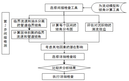 LP-ICDA間接檢測不借助任何檢測工具,而是通過(guò)分析流體模型和管道高程剖面圖,評價(jià)內腐蝕評估區間內腐蝕發(fā)生的可能性沿管道里程的分布[3],其流程如圖2所示。該步驟需要將臨界速率、水分或固體積聚的臨界傾角與管道高程比較分析,在最長(cháng)周期內腐蝕性介質(zhì)積聚可能性最大的位置發(fā)生內腐蝕的可能性最大,通過(guò)該項分析可確定詳細檢查的位置。傾角不是唯一影響水和固體積聚的因素,因此積聚也有可能發(fā)生在水平管段。
