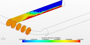 從管道中的油水兩相體積分布云圖(見(jiàn)圖4)可以看出,入口端管道直管段內,油中的水基本可以被油直接帶走,未出現明顯的油水分層現象。但在彎頭位置,離心力作用將水甩到管道外側,使管道外側的水含量明顯增多。在盲管段,油和水發(fā)生分層,管道底部出現水沉積,三通管口1.5~2 m距離往后流速很低,盲管深處速度幾乎為零,水沉積現象更為明顯。